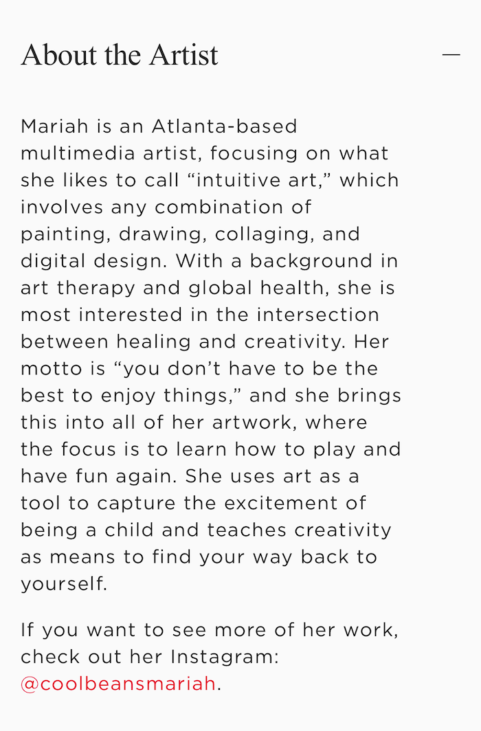 The start of my art teaching began when I worked as an Art Camp Counselor at Emory University in Atlanta, GA in 2022 and then taught a class at the Museum of Design of Atlanta in 2024. From 2024 to 2025, I worked for an Atlanta local non profit, Paint Love. Using a trauma-informed model of meeting students where they are, Paint Love provides arts education and mural collaboration across schools and business all over the Atlanta Metro Area.