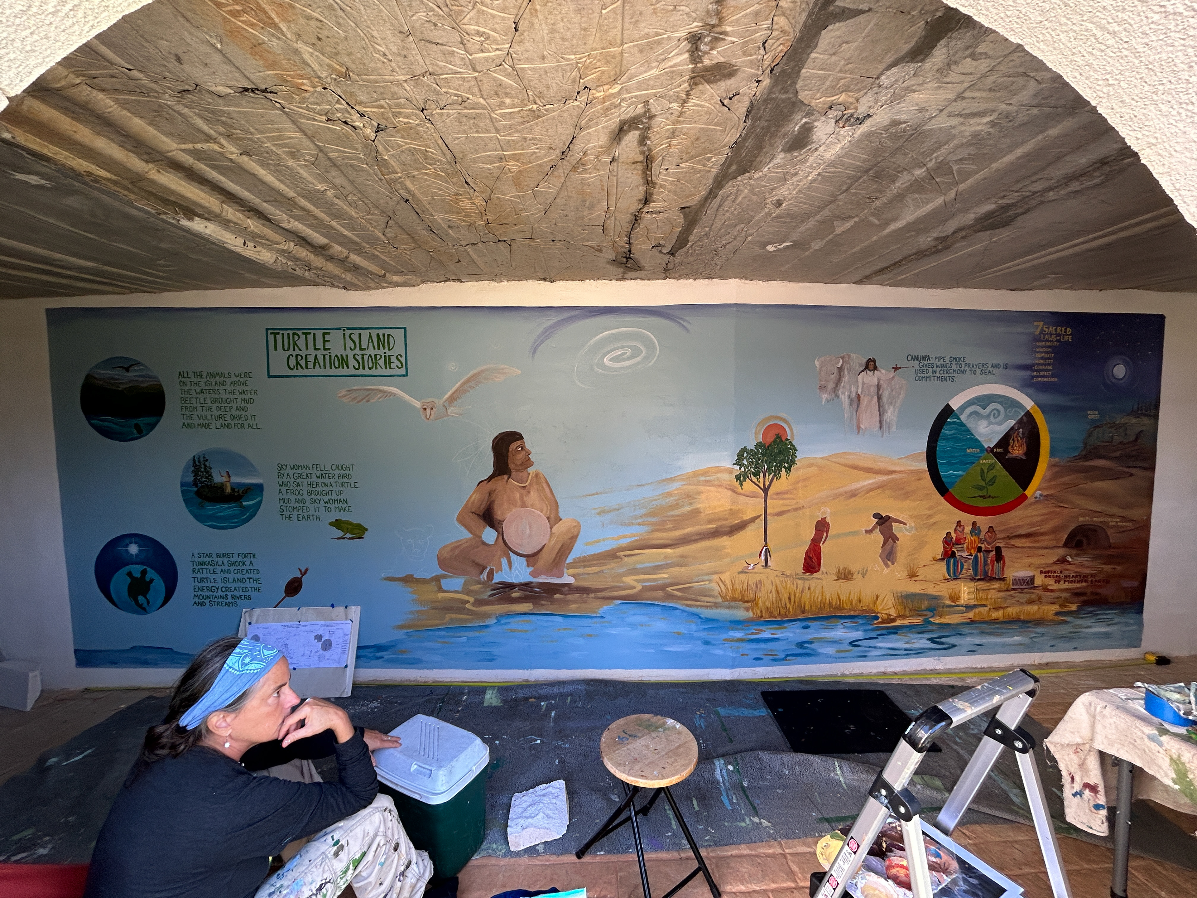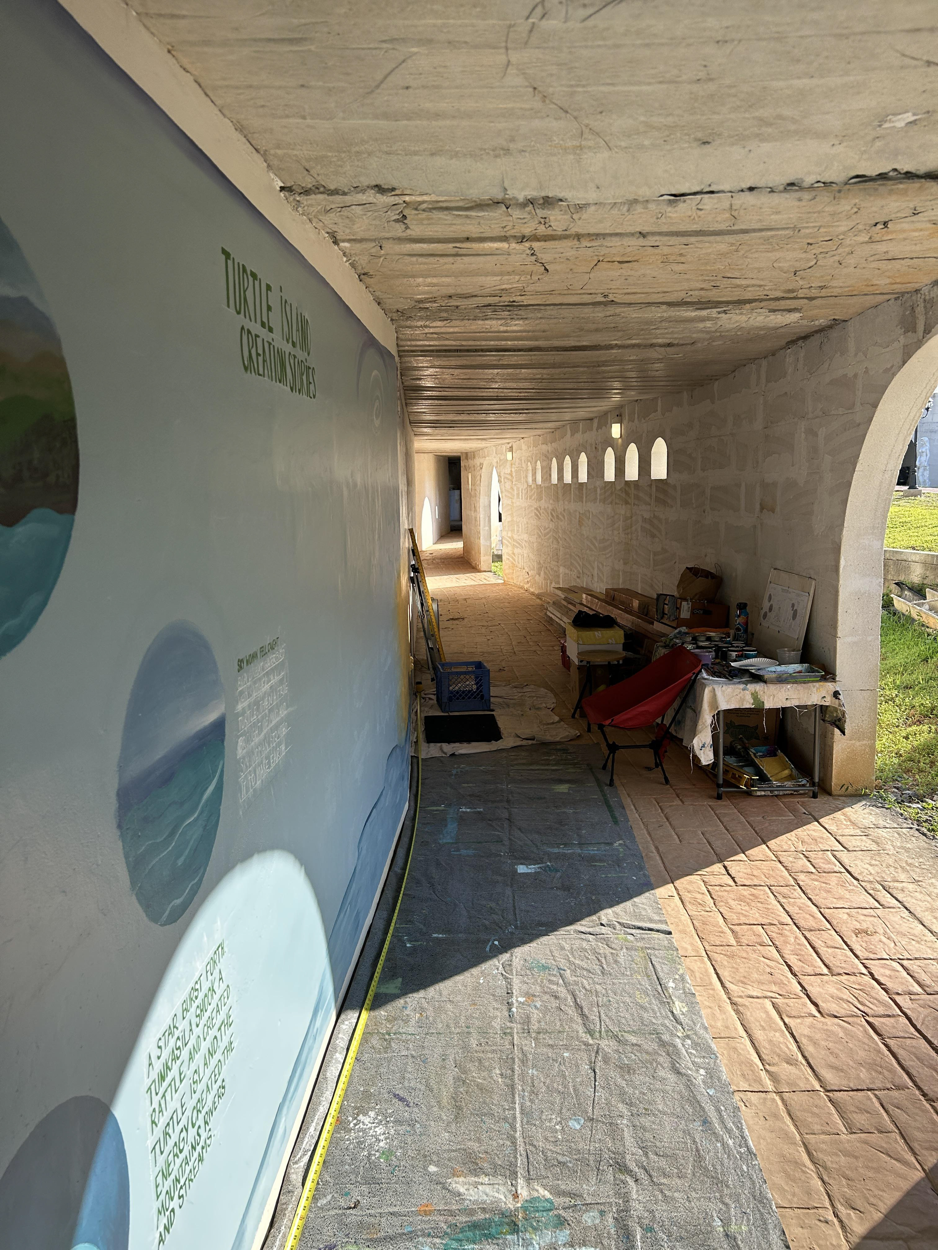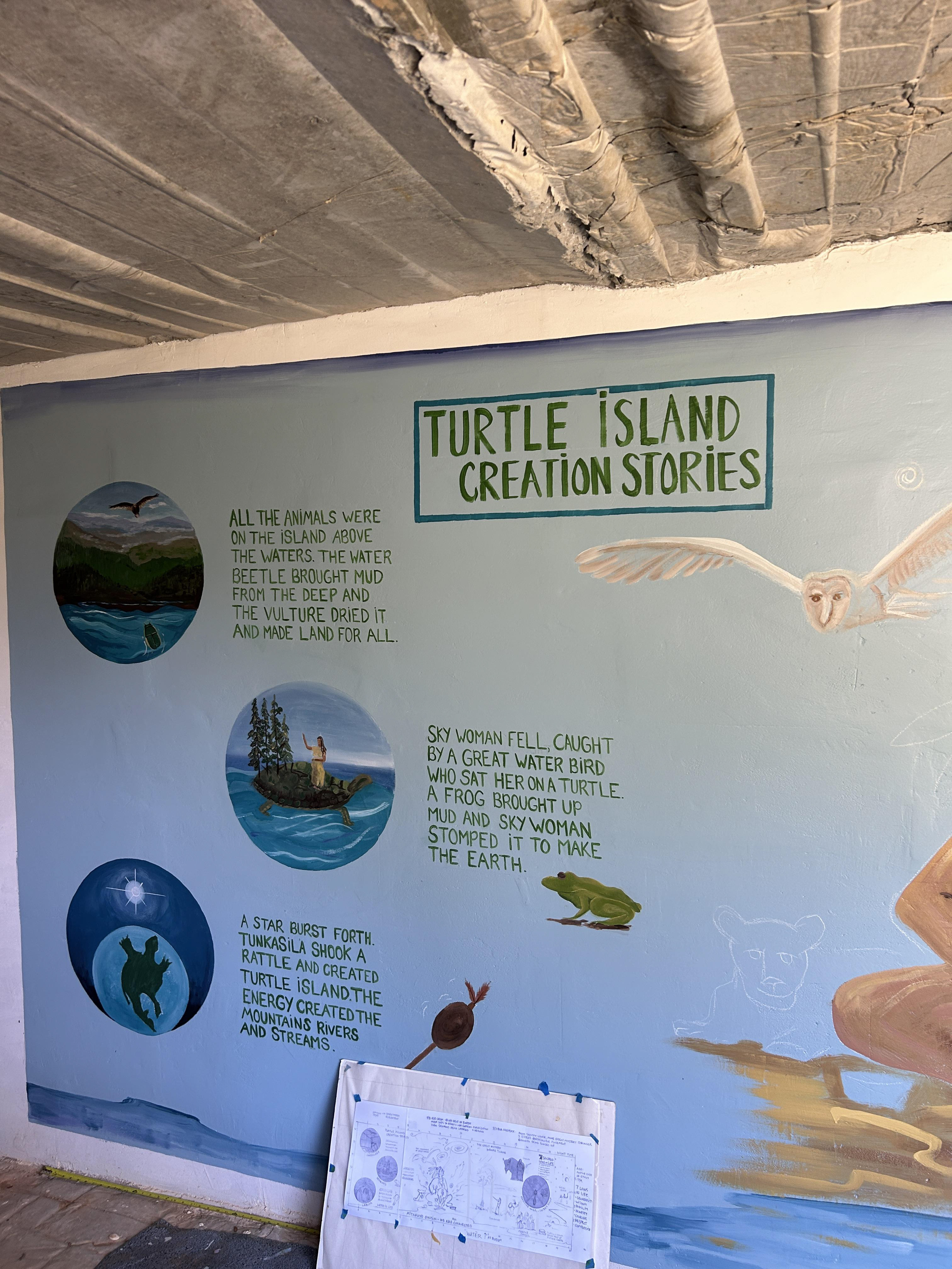 My mentor was hired to paint a mural at a castle that hires artists to highlight different world belief systems. I worked on the lettering and parts of the imagery of the Turtle Island Creation Stories.